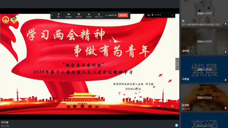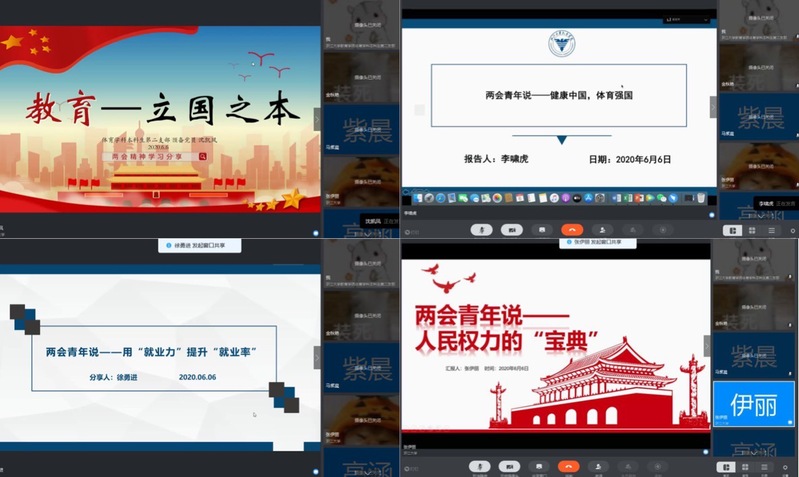 2020年6月6日,教育学院体育学科本科生第二支部以“学习两会精神、争做有为青年”为主题,紧紧围绕2020年全国“两会”精神,进行了线上学习分享会,旨在通过深入学习领会“两会”精神,厚植爱国主义理想信念,提高支部党员党性修养,争做新时代新青年。