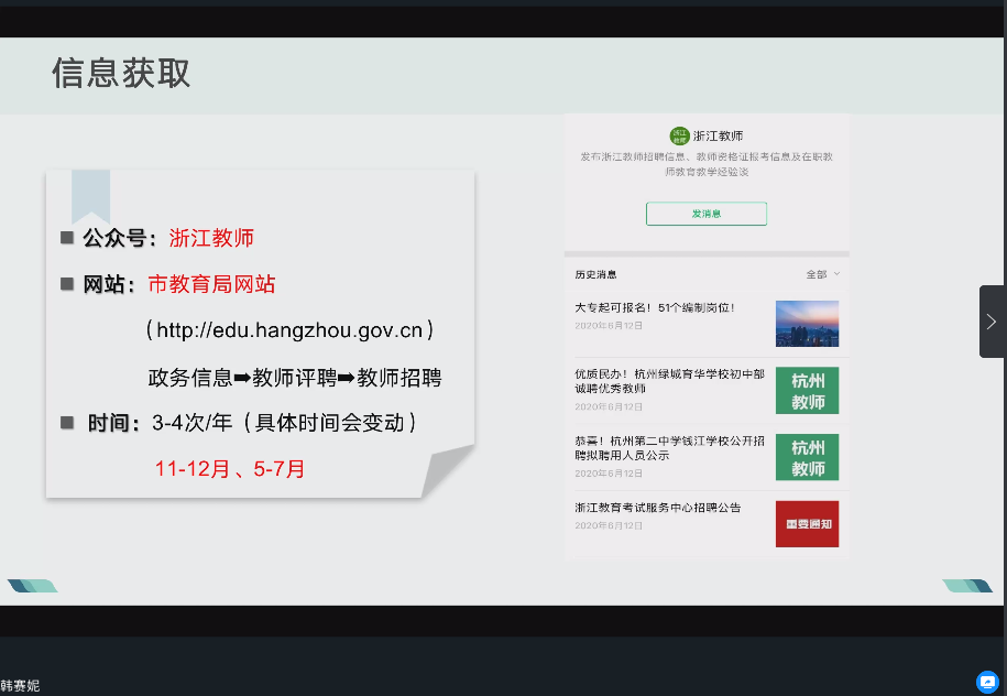 首先是2017届运动训练专业硕士生韩赛妮学姐,现任于浙江省杭州高级中学。作为一名高中体育教师,学姐既为大家分享了自己应聘备考和入职工作方面的经验,还转述了杭州高级中学语文教师的就业经验,用心诚也。