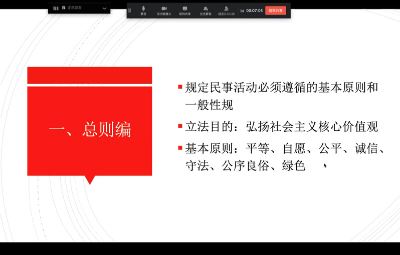 首先,胡辰筠同学作《民法典》相关的主题党课。《民法典》是新中国成立以来第一部以“法典”命名的法律,是新时代我国社会主义法治建设的重大成果。胡辰筠同学对《民法典》的总则编、物权编、合同编、人格权编、婚姻家庭编、继承编、侵权责任编分别进行详细阐述,内容涉及社会和经济生活的方方面面。《民法典》回应了人民群众对美好生活的需求,值得我们仔细研读和学习。