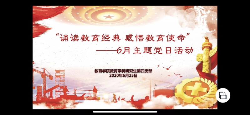 2020年6月25日晚,教育学科研究生第四支部召开线上主题党课及党日活动。由于疫情期间条件限制,本次会议在浙大钉app中以视频会议的形式开展,由胡辰筠、陈瑶瑶同学主持。