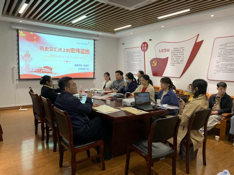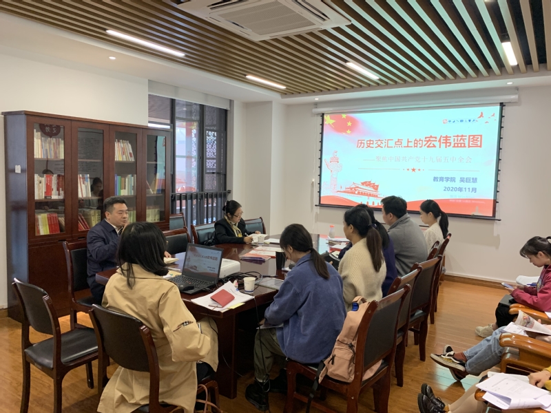 2020年11月12日中午,教育学院开展2020年度党支部书记集中轮训首场专题培训,由学院党委书记吴巨慧作“历史交汇点上的宏伟蓝图——聚焦中国共产党十九届五中全会”专题党课。学院各师生党支部书记及部分支部支委,学院兼职辅导员等到会学习。