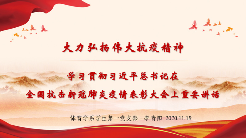 2020年11月19日,教育学院体育学系学生第一支部开展“承前启后,做好时代接班人”主题党日活动,支部李青阳同学作“大力弘扬伟大抗疫精神——学习贯彻习近平总书记在全国抗击新冠肺炎疫情表彰大会上重要讲话”微党课分享。