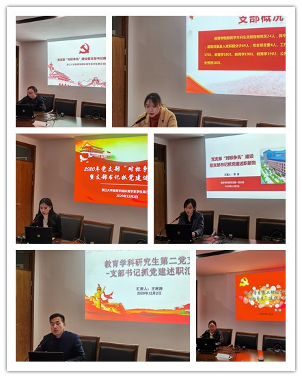 教育学院党委已连续4年组织年度支部书记抓基层党建述职评议工作。当天的述职会上,学院15位师生党支部书记逐一上台,围绕支部概况、“七个有力”执行情况、“对标争先”建设计划落实情况、支部工作特色亮点、存在问题与整改举措等方面汇报了2020年度支部党建工作。