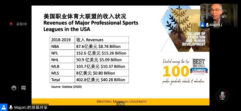 12月1日晚,教育学院体育学系2020年学术系列讲座活动通过线上平台顺利举行。美国西密歇根大学教育与人类发展学院院长、博士生导师,体育学系1986届体育理论专业校友李明教授应邀作《美国职业体育经济学》主题讲座。