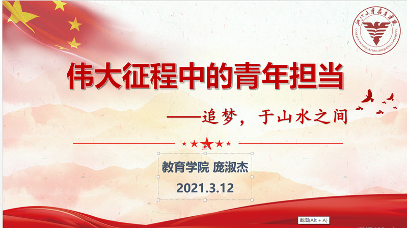 2021年3月12日,教育学院教育学本科生支部3月党员大会在教院大楼103教室举行。2018级本科生庞淑杰面向支部成员作了题为《伟大征程中的青年担当——追梦,于山水更深处》的微党课。