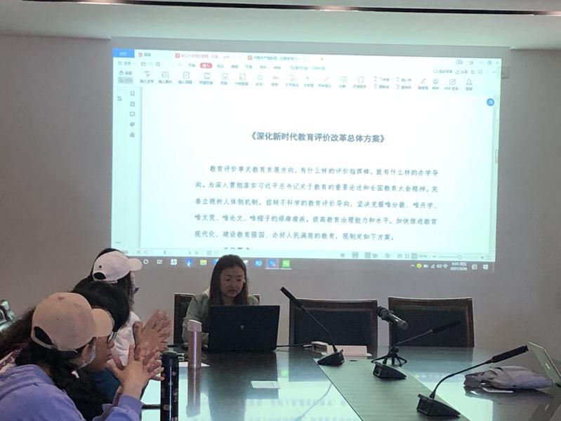 会议开始,马岚老师首先着重讲解了中共中央国务院印发的《深化新时代教育评价改革总体方案》。她指出,文件的重点内容需要我们在理解把握的同时,落实到学习工作中。作为浙江大学教育学院的学子,更应从现在开始时刻关注国家要求与指示,紧跟文件思想树立“育人”榜样。支部成员们在会议前以自主学习过《方案》内容,在聆听马岚老师的讲解后,同学们对该文件有了更深刻的理解。