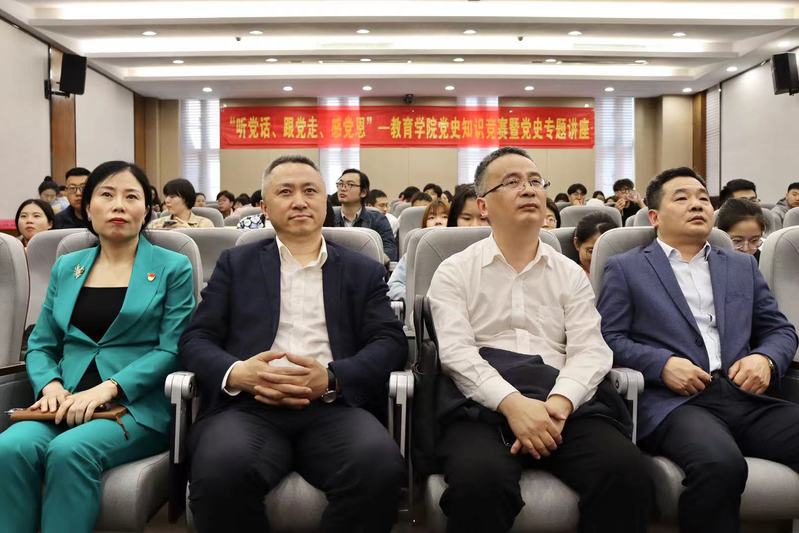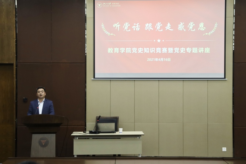 本次活动共分三个议程,一是党史知识竞赛,二是预备党员宣誓,三是《中国共产党为什么“能”》主题讲座。教育学院各学生党支部党员及入党积极分子代表近200人参与了本次活动。浙江《共产党员》杂志编辑部余建红副主任、浙江大学党史学习教育第三巡回指导组组长徐国斌老师、教育学院党委书记吴巨慧老师、教育学院党委副书记包松老师与学院专职组织员巫微涟老师出席活动。