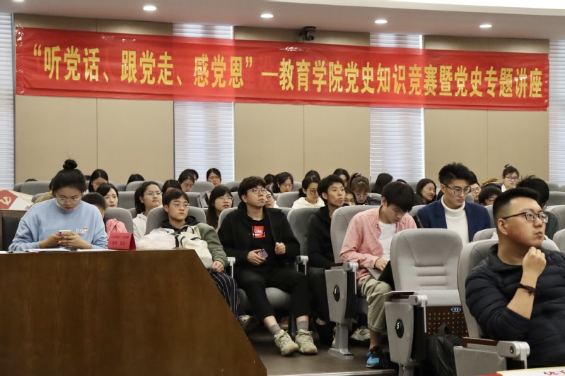 2021年4月16日下午,紫金港校区教育学院大楼118报告厅座无虚席,教育学院党史知识竞赛正在如火如荼地进行。自去年10月起,为迎接建党100周年,从党的百年伟大奋斗历程中汲取智慧和力量、深入学习贯彻习近平新时代中国特色社会主义思想,教育学院全体学生党支部开始参与党建理论知识题库的构建工作。在完成历时6个月的题库构建、校对、交叉评测后,学院组织了本次“听党话、感党恩、跟党走”党史知识竞赛,真正实现了党史学习教育的“自学、自评、自测”。