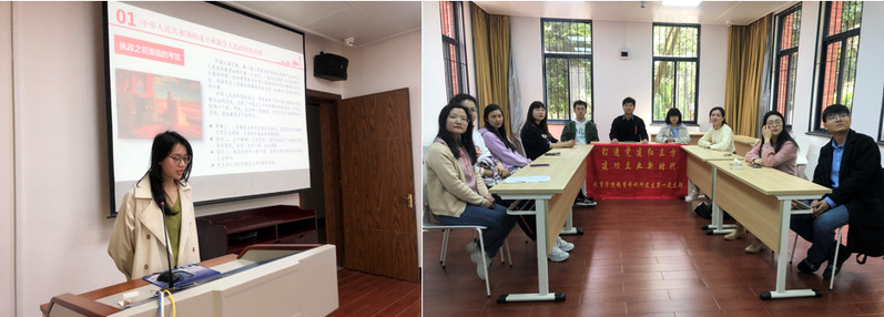 随后,一行人步行来到了浙江大学之江校区,在教学楼里聆听了一个“红色故事”——中华人民共和国的成立以及社会主义制度的建立。水鑫怡同志带领大家回顾了社会主义革命时期(1949年-1956年)的重要事件,即中华人民共和国的成立和新生人民政权的巩固、抗美援朝战争、土地制度改革和其他民主改革、国民经济的恢复和各项建设的展开、党在过渡时期的总路线和有计划大规模经济建设的开始以及社会主义改造的基本完成和社会主义制度的建立。在分享心得感悟时,雷鹏同志表示,中华人民共和国的成立和社会主义制度的建立,是在中国共产党领导下实现的伟大成就,许许多多先辈们为此付出了生命的代价。而随着社会的发展,新时期的我们作为未来推进中国发展的主力军,更是要明确自身的目标和理想,为了美好的明天而不断奋斗。尤其作为浙大学子,要牢记竺可桢校长的两问:到浙大来做什么?将来毕业后做什么样的人?