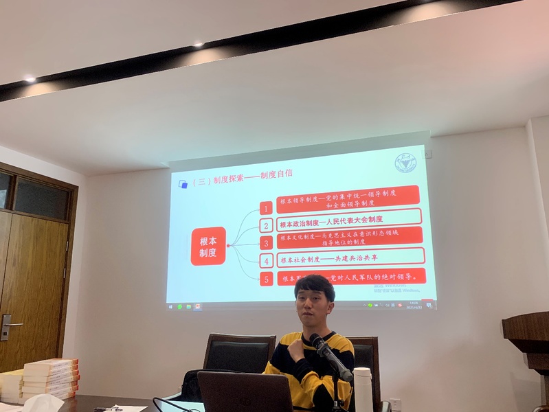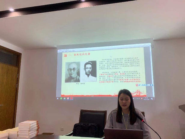 在理论学习之后,潘娜瑛和姜远谋通知做了微党课分享。潘娜瑛以一大召开的故事为主题,向大家介绍了一大召开的艰辛过程和重要意义。姜远谋从为什么要学历史引入,向大家介绍了中共二大的召开和第一部《中国共产党章程》。