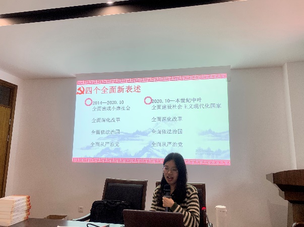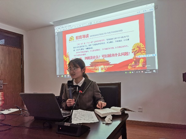 随后,程郎可意和张露分别从四个全面与五位一体引入带领大家学习了《习近平新时代中国特色社会主义思想学习问答》。程郎可意带领大家学习了脱贫攻坚战、全面深化改革的意义、全面依法治国的本质等,还联系实际生活分享了要着力培养忠诚干净担当的高素质干部的重要性。张露从五位一体的发展历程谈起,介绍了五位一体的发展过程及其重要意义,并结合材料学习了我国经济的高质量发展、新民主主义以及伟大的抗疫精神等。通过导入学习,指导大家多学习、多吸收。