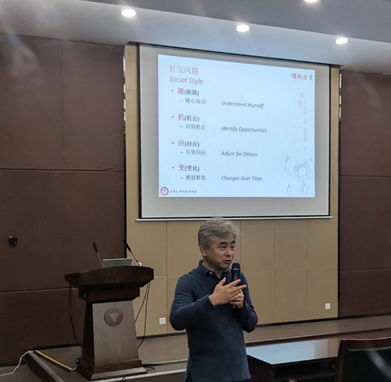 先,戴民老师做了简短的自我介绍,顺便向大家介绍了职慧,然后直奔主题提出了社交风格中“随机应变”的概念:”是随心而变,“”是识别机会,“”是有效回应,“”是潜移默化。