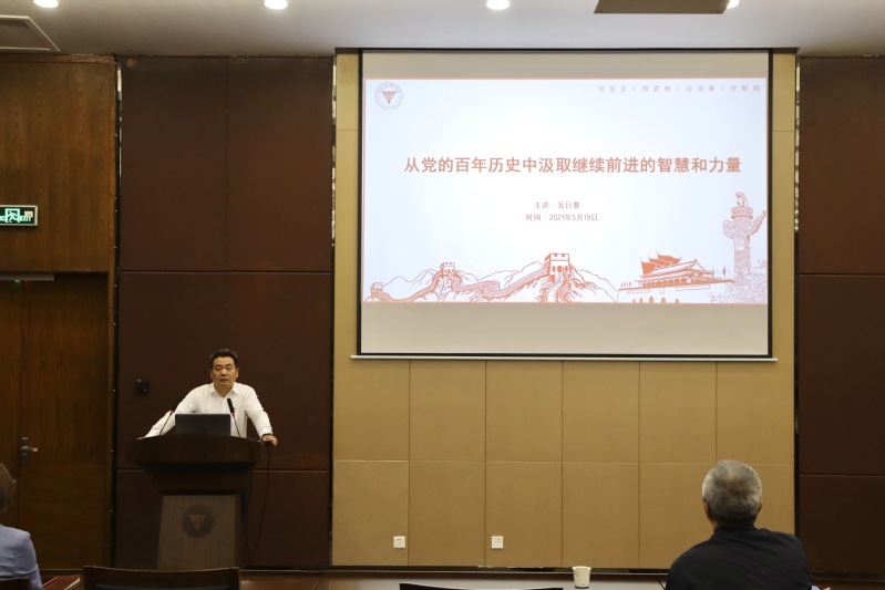 吴巨慧书记首先对中国共产党从1921年到2021年筚路蓝缕、披荆斩棘、艰苦创业、砥砺前行的百年历史做了纲要式梳理。他以中国人民从“站起来”到“富起来”再到“强起来”的三个发展篇章为主线,为在场师生勾勒出一幅中国共产党的百年发展图景。吴书记重点梳理了新民主义革命时期和社会主义革命和建设时期,共产党是如何经过顽强奋斗团结带领人民实现了中华民族从“东亚病夫”到站起来的伟大飞跃。争取民族独立、人民解放和实现国家富强、人民幸福,是中国共产党百年历史的主题和主线,把革命、建设、改革、复兴事业不断推向前进,是中国共产党百年历史的鲜明特征,逐步实现救国、兴国、富国、强国的奋斗目标,是中国共产党百年历史的庄严使命。面对中华民族伟大复兴的战略全局和世界百年未有之大变局,只有从百年党史中汲取智慧与力量才能以昂扬姿态更好地投入到全面建设社会主义现代化国家新征程中去。在对百年党史作出提纲挈领式的归纳后,吴书记又带领大家学习了从百年发展历史中总结出的十三条宝贵经验。通过回看走过的路,比较别人的路得出的弥足珍贵的经验能够指引我们远眺前行的路,坚定迈向未来的路。