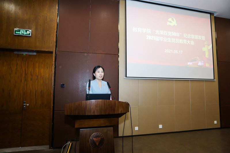 2021年6月17日下午,教育学院“光荣在党50年”纪念章颁发仪式暨毕业生党员教育大会在学院118报告厅隆重召开。教育学院50周年以上党龄老党员代表、学院2021届毕业生党员及2021年新发展党员参加大会。会议由学院党委副书记包松主持,学院党委书记吴巨慧出席会议并致辞。