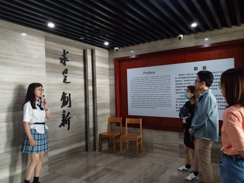首先,支部组织全体党员共同参观了校史馆,学习我校不同历史时期中涌现出来的优秀师生榜样。在讲解员的带领下,我校124年的风雨历程如画卷般呈现在全体党员面前。进入校史馆,如历史长河缩影般的巨幅《惟学无际》,将历任校长、优秀学者印入画中,群星璀璨。徜徉于馆中,浙江大学严谨的求是学风、执着的创新精神,都映射在大批优秀人才以及丰硕的科研学术成果中。“希望在未来,灿若星辰的浙大人和浙大精神都能指引我不畏险阻,勇往直前”,参观结束后,21届毕业生吕梦园有感而发。同时,支部副书记杨帆骏进行了“两优一先”先进典型的分享,带领支部成员共同学习了陈立群校长“支教扶贫 一片丹心”的优秀事迹。