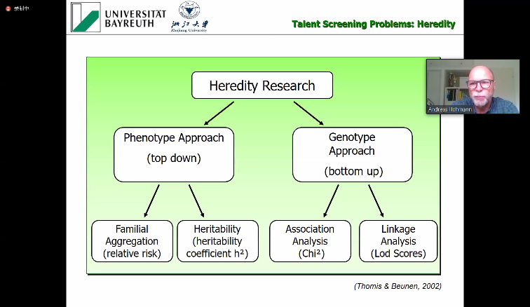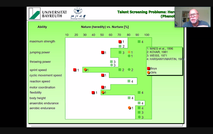 6月25日晚,德国拜罗伊特大学、德国运动科学协会训练科学部发言人Andreas Hohmann教授作题为“运动员选材的理论与方法”讲座,向同学们讲述了运动员选材的依据、方法以及天赋的重要性。从遗传、运动表现的角度向我们讲解了不同年龄段运动员的选材,并向我们介绍了训练营、6-18岁青少年体质测试方法以及评价方法。
