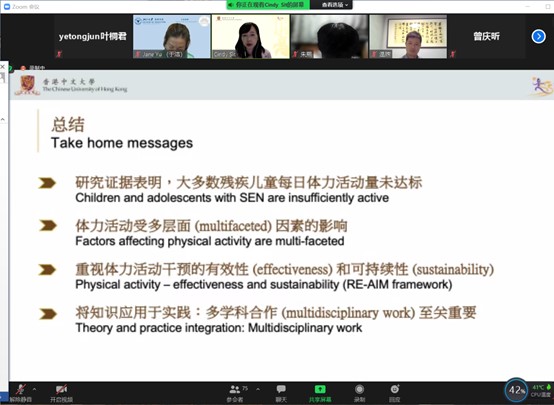 6月24日晚,香港中文大学教育学院副院长Cindy H.P. SIT教授作题为“对有特殊教育需要的儿童和青少年的体育活动干预”讲座。讲座针对残疾人群(儿童及青少年)的特殊情况,从理论及其影响因素方面出发,对这一特殊群体的体力活动不足提出了解决方案,旨在保障这一占全球总人数约15%的庞大群体的体力活动水平,并促进其身体健康。
