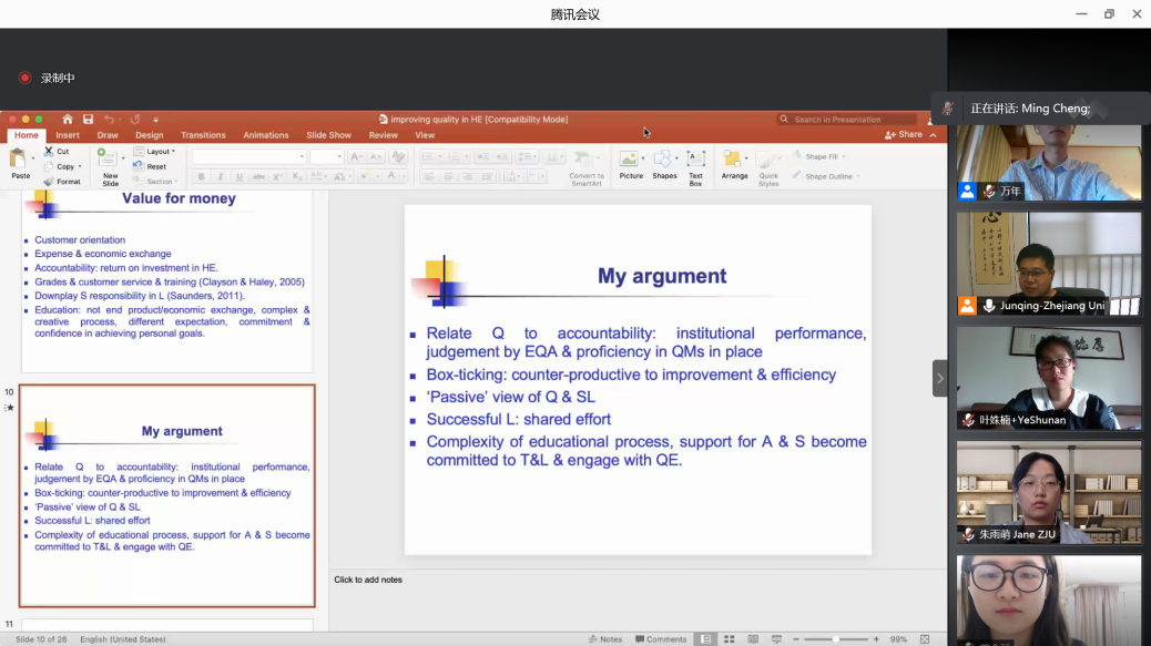 北京时间7月12日下午,暑期学校首讲开讲。英国知山大学(Edge Hill University)Ming Cheng教授带来了题为“高等教育质量评价:关键利益相关者的观点“的报告。Ming Cheng教授是知山大学高等教育研究领域的教授,担任高等教育研究小组主任。她的研究领域包括教育国际化、课程国际化、研究生学习与监督、国际学生体验和质量评估。在报告中,Ming Cheng教授讲解了英国不同类型高校的区别,随后探讨了评估高等教育质量的利弊。她在五个已完成的研究项目基础上,对与质量评估相关的四个最常用术语——适用性、物有所值、学生满意度和学生客户化,做了批判性回顾,探索学者和学生的经验及其对于高等优质教育的观点,批判现代高等教育指标化的趋向。讲座结束后,Ming Cheng教授同浙大师生就中英高等教育质量评价区别、教师专业性和信息时代的教育评价等话题做出探讨,大家受益匪浅。