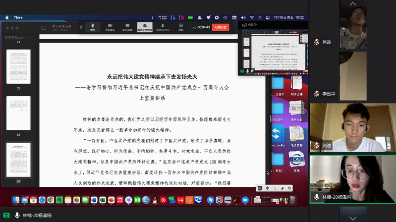 随后,支部书记林楠老师结合近期时事热点,带领大家重点学习了习近平总书记在庆祝中国共产党成立100周年大会上的讲话。林老师指出,立足新的百年历史新起点,我们青年要坚决响应总书记和党中央的号召,牢记初心使命,坚定理想信念,践行党的宗旨,进一步胸怀“国之大者”。以远大的梦想追求为指引,以人民情怀与历史担当为动力,以奉献牺牲精神为传承,在学习工作中开拓进取。把个人的前途命运同祖国的前途命运紧密连接,努力为将祖国建设为社会主义现代化强国的目标接续奋斗!