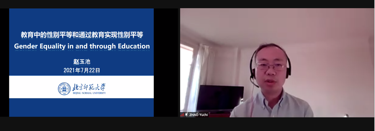 7月22日下午,联合国教科文组织女童和妇女教育奖项目和海航信托基金项目(法国巴黎)协调员赵玉池博士围绕“教科文组织和教育性别平等”主题发表报告。赵博士首先对教科文组织和性别平等的定义、战略等进行了详细介绍,强调性别平等作为教科文组织全球优先事项之一的重要性。随后,赵博士指出在全球教育中,经常将性别刻板印象视作社会规范而不断进行再生产,因此,必须对这些观念和做法进行挑战,并在教育中重构公平。最后,赵博士还结合用以应对新冠疫情的“性别旗舰计划”及女童和妇女教育奖,说明了教科文组织在促进性别平等方面所做的努力。