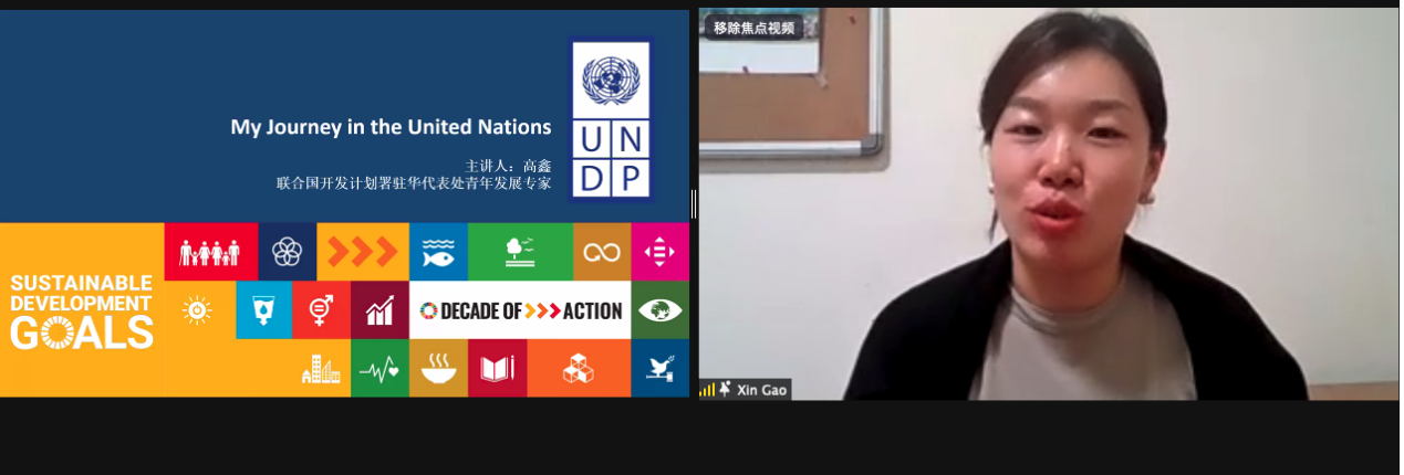 联合国开发计划署驻华代表处(中国北京)青年发展专家高鑫女士讲述了个人怀揣着外交官的梦想,从亚太经合组织(APEC)到联合国开发计划署(UPDP)的工作经历,分享了在工作中遇到的重大挑战及应对策略,还为同学们详细分析了联合国所需要的人才特质、工作技能以及申请联合国工作的渠道。