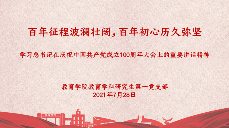 7月28日晚,教育学科研究生第一党支部举行主题为“百年征程波澜壮阔,百年初心历久弥坚”的党史学习教育党日活动。会议学习了习近平总书记在庆祝中国共产党成立100周年大会重要讲话精神,支部成员围绕个人学习感悟和心得展开交流讨论。会议通过钉钉在线上举行,由支部书记苏洁主持。