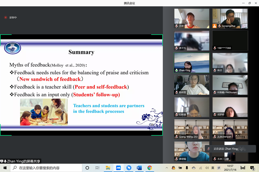 7月16日上午,香港教育大学助理教授Zhan Ying为同学们带来了关于教学回馈的讲座。“回馈”是一个循环和交互的过程,学生会收到回馈信息,并比较自己的学习状态。回馈与评估发展密切相关,是形成性评价的重要部分,拥有改善学生学习、汇报与绩效和鼓励学生的功能。但是,学生也不是一直充分接受老师的反馈,其原因包括教室中的权力关系、回馈的难以理解、回馈的质量与滞后性等。Zhan教授指出,需要避免针对个人的、常模参照的(norm-referenced)、判断性的和消极的回馈。老师提供了两种口头评价模式,一种是赞美-批评-赞美,另一种是提问-说明-提问,两种模式需要根据具体的学生和情境选择。Zhan教授给出了教师针对学生反馈的四大要素:回馈不必全到位,突出重点为关键;针对学习不对人,对照标准提意见;语言使用要谨慎,莫伤学生自尊心;询问告知再询问,学生行动成效现。为培养学生进行同伴评估,教师可以进行优秀案例对比,通过提问引导学生把注意力放在任务的一部分,展示评估过程,让学生重视互相批评指正的朋友的重要性等。