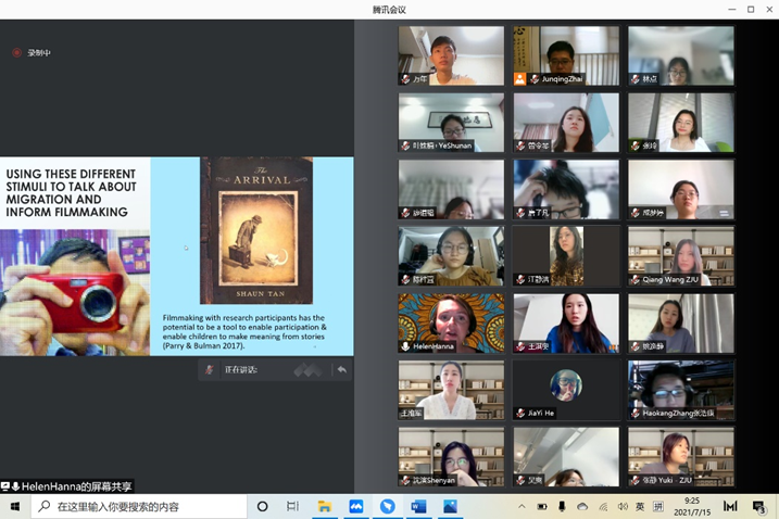 7月15日上午,来自香港教育大学的助理教授Helen Hanna为同学们展开一场关于教学中的视觉手段的报告。首先,她介绍了不同的视觉方法,以及为什么要使用它们。在她的观察中,英国和南非很多的小学儿童使用几乎没有文字的图画书。这些图画书将作为开放讨论的起始点。除此之外,摄影和摄像也是常用的视觉方法,是一种不需要特定语言的表达方式。其次,她分析了关于南非移民学习者的特别研究,并在研究中发现学生的沉默有充分的意义。最后,她讨论为了优质教育,研究需要做什么。研究者和教师需要充分倾听和理解儿童,包括他们的沉默;需要充分使用研究和教学工具,探索如何将研究成果转化为“优质”教育。
