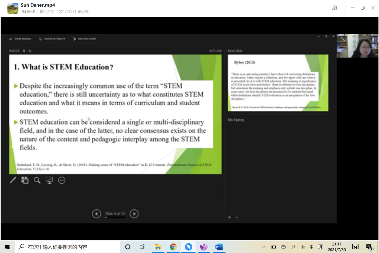 7月16日上午,香港教育大学助理教授Daner Sun为同学们展开关于STEM教育的讲座。她指出,STEM教育可以被视为一个单一或多学科领域,就后者而言,STEM领域之间的内容性质和教学相互作用没有明确的共识。她认为,STEM教育是一种跨学科的学习方法,采用严谨的学术概念并结合真实世界的课程,学生将科学、技术、工程和数学应用于学校、社区、全球企业等环境中,促进STEM识字率的发展和新经济中的竞争力。在中国香港,九项共通能力(Generic Skills)是教育需要培养的基础能力,帮助学生学习获取知识、构建知识,并应用知识解决新问题。STEM教育对促进共通能力有着极大的作用。