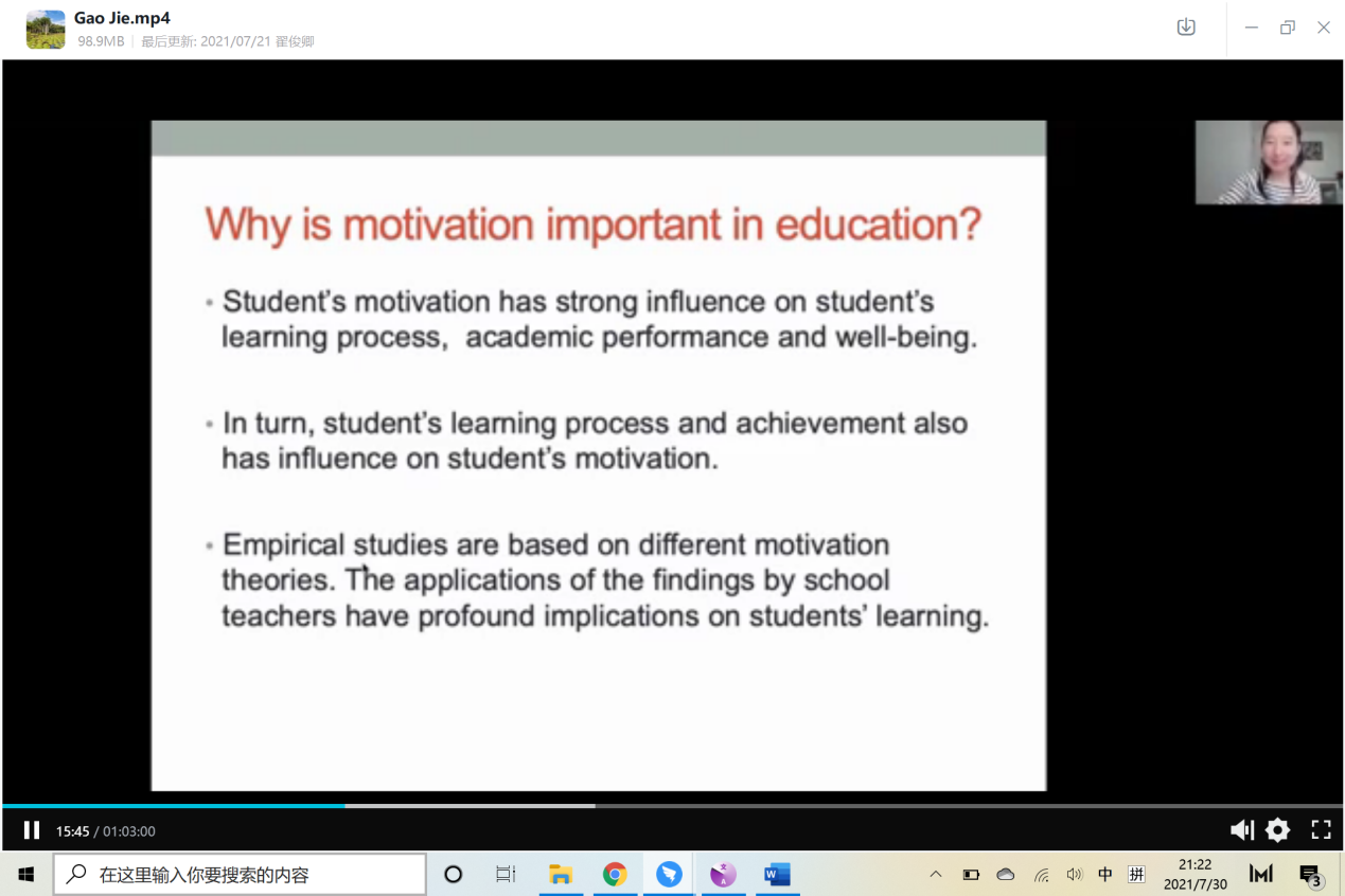 7月20日下午,学前教育领域的专家、伦敦大学学院教育学院讲师Jie Gao博士围绕“如何激励学生:教育中的激励理论”这一主题与同学们进行分析和讨论。Gao博士通过一系列的教育动机理论,包括需要理论、行为理论、社会认知理论、归因理论、期望价值理论、目标导向理论和自我决定理论,探讨如何激励学生,批判性地讨论了每种理论的优点和局限性,并与同学们探索如何将这些理论应用于实际环境中。