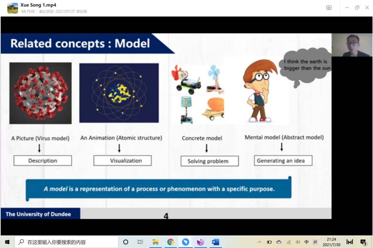7月26日下午,英国邓迪大学教育学院的助理研究员Song Xue博士分享了他的博士求学经历以及博士期间所做科学教育建模研究。Xue博士的兴趣集中于科学教育、科学建模,他以通俗易懂的方式讲解了模型、建模的基本概念,并介绍了四种常见的建模策略。Xue博士认为建模作为一种教学方法,在STEM教学过程引入建模策略,有助于学生的学习。最后,Xue博士针对未来教师给出了四个具体的建议。他的跨学科视角和实践性研究给学生们留下了深刻的印象,启发了大家对跨学科教育的思考。