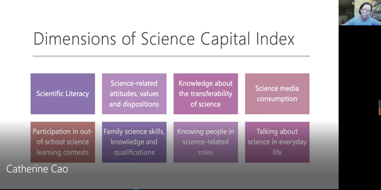 7月22日下午,伦敦国王学院教育传播与社会学院的助理研究员Catherine Cao分享了“探索中国学生的科学参与:科学资本的视角”的研究。在报告中,Catherine首先引入了中国学生的科学参与的问题。虽然中国学生在连续几年PISA测试中获得优异的成绩,但学生对未来从事科学职业的意愿并不突出。在科学资本理论框架的视角下,Catherine介绍了科学资本的相关概念以及测量维度。她对ASPIRES 2的问卷进行了改编,面向城市和农村不同类型的学校分发1109份问卷,同时结合访谈的方式进一步探究影响中国学生科学参与的深层原因。最后,Catherine分享了她的研究结论:一是农村学生的科学资本和科学职业理想之间存在显著的相关性,而城市学生的相关性则并不明显;二是与科学职业相关的职业理想往往受到教师的影响,因此要加强农村地区教师对学生科学职业理想的引导作用。