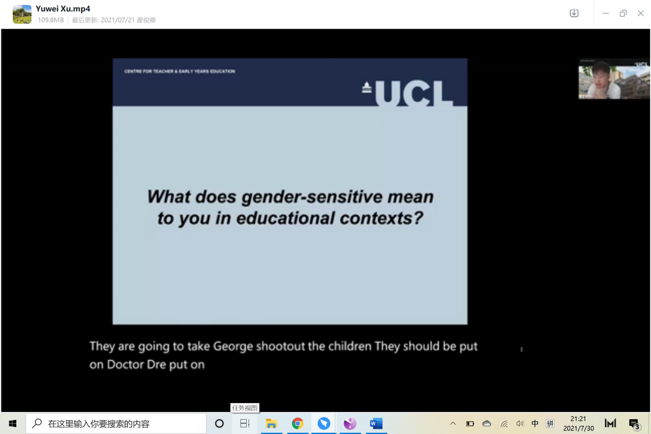 7月19日下午,来自伦敦大学学院的Yuwei Xu博士带来关于“性别与教育”的主题讲座。本次讲座从教师和儿童的角度以及在全球南北国家的情景中探讨性别如何影响学前教育。Xu博士认为要促进跨文化的教学方法,需要提高主导性别话语如何影响当地文化中儿童的价值观和实践的意识;需要告知性别敏感的做法和可能的后果;需要鼓励重新思考教学价值观及其对更广泛的社会正义和公平的影响;需要促进各国之间文化差异和相似之处的相互理解,并使儿童成为全球公民。在讲座最后,Xu博士启发同学们去思考如何将性别意识纳入到教育中并去实践。