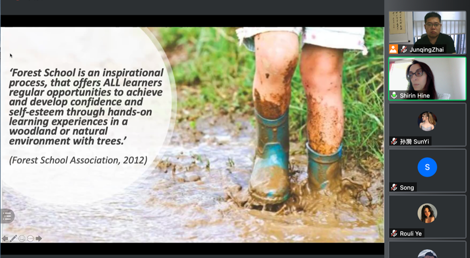7月22日下午,伦敦国王学院教育传播与社会学院的助理研究员Shirin Hine做了题为“英国森林学校的实践现状及其在环境教育中支持性别平等和社会正义的潜力”的报告。Shirin首先解释了什么是森林学校,总结了六个主要特点,并从多个方面说明了森林学校的重要性,包括森林学校对性别不平等问题的改善作用。在报告中,Shirin详细介绍了关于儿童在传统教室和森林学校环境中性别建构的不同之处的研究。她指出从6周的参与观察研究中发现在森林学校里性别-刻板印象行为比在教室里更明显。此外,在森林学校比在教室里更有可能摆脱限制性的性别-刻板印象。最后,她指出我们在环境教育方面需要做的改变,以及COVID-19疫情后所带来的机遇和挑战。讲座结束后,Shirin就森林学校和性别平等等话题做出探讨,大家受益匪浅。