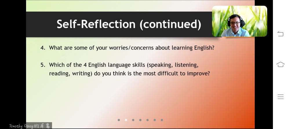 学术英语课程是本期暑期学校的学习重点,通过教师课程教授、英语学习技巧分享、课后阅读、与夏大本校学生实战交流等形式,提升参与本期项目的学生的学术英语水平与实际应用能力。学术英语课程由Tim Dang老师主讲,主要从英语的听、说、读、写以及语法和发音这几个重点方面进行讲解,通过课堂教学、课后作业及自我评估,对学习内容进行实时巩固。课程还组织了三次与夏威夷大学本校学生的线上面对面谈话交流,这对很多同学来说是第一次完全用英语与外国学生直接对话。这项环节通过实践帮助同学们运用、检验、巩固自己的学习成果,不仅锻炼了听力水平和口语能力,也帮助同学们进一步了解了夏威夷文化以及美国学生的学习日常。