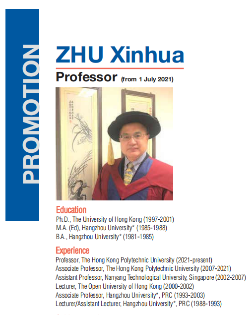 祝新华教授原杭州大学教育系81级本科生,85级三年制硕士生,毕业后留校任教。后于香港大学获哲学博士学位。曾任教于新加坡南洋理工大学教育学院,现任教于香港理工大学中文及双语系,博士生导师。