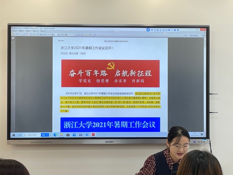 宣传委员张露带领大家学习了浙江大学2021年暑期工作会议精神,并通过对比2020年、2019年浙江大学暑期工作会议精神,让大家更深刻地理解了今年暑期工作会议的主题——深入学习贯彻习近平新时代中国特色社会主义思想和习近平总书记对浙江大学的系列重要指示精神,加强政治建设,胸怀国之大者,聚焦学校“十四五”事业发展和新一轮“双一流”建设,围绕开新局、谋新篇,凝聚奋斗力量,面向未来扎根中国大地迈向世界一流大学前列新征程,为实现第二个百年奋斗目标贡献浙大力量。