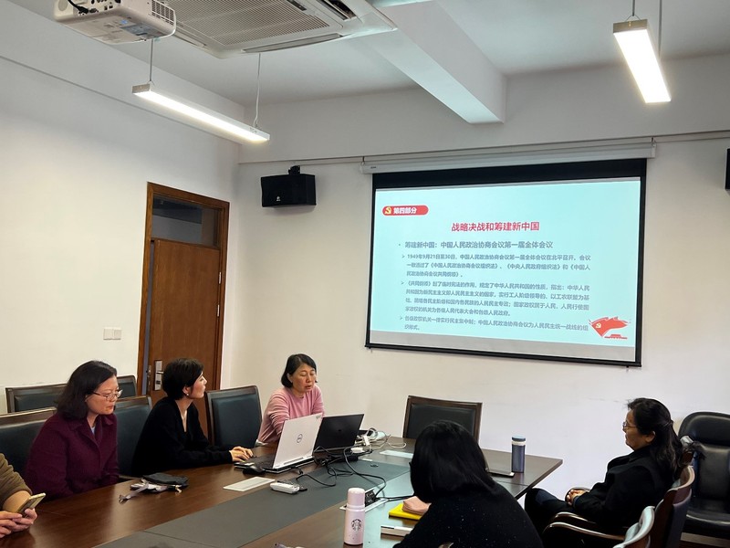 会议第一个议程,支部成员司琦老师以微党课形式,带领支部全体成员深入学习了抗日战争胜利后中国共产党带领人民军队进行解放战争的历史,系统回顾了国共两党方针战略、重庆谈判等解放战争爆发的历史背景,防御、反攻、决战等解放战争的三个战略阶段及其过程中社会局势的不断变化,以及新中国的筹建工作。