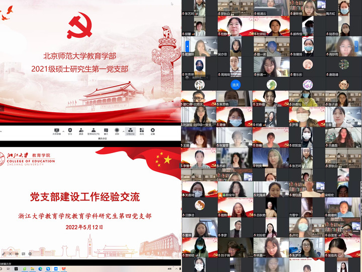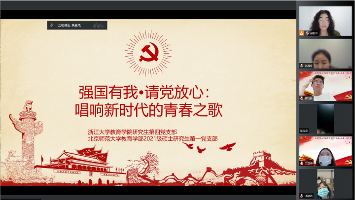 为迎接党的二十大、庆祝中国共产主义青年团成立100周年,浙江大学教育学院研究生第四党支部(以下简称教研四支部)与北京师范大学教育学部2021级硕士研究生第一党支部(以下简称教硕一支部)于2022年5月12日通过腾讯线上会议联合开展“强国有我,请党放心:唱响新时代的青春之歌”主题党日活动。此次活动由教硕一支部书记关嘉琦主持,两支部党员及所覆盖班团的70余名同学参与。