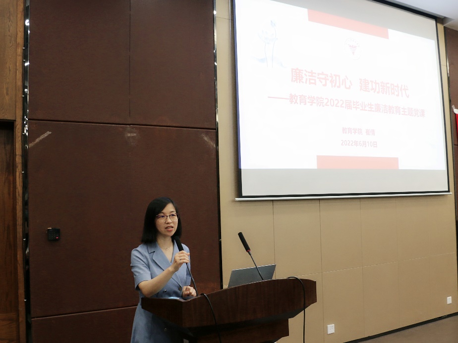 接着,党委副书记兼纪委书记崔倩老师为2022届毕业生做了主题为“廉洁守初心、建功新时代”的廉洁教育党课。崔倩老师告诫毕业生们必须牢记清廉是福、贪欲是祸的道理,并详细剖析了低龄职务犯罪的心理,引导毕业生们未来走上就业岗位要不断做到清廉自守,并从政治关、权力关、交往关、生活关、亲情关做到“积福”“避祸”。之后崔倩老师介绍了浙大干部风格,以及竺可桢、舒鸿等的清廉故事,并以腐败典型案例为毕业生们拉响警钟。“清澈的爱,只为中国!”崔倩老师为毕业生们送出了寄语,并祝愿同学们在实现中华民族伟大复兴的中国梦中谱写青春新华章。