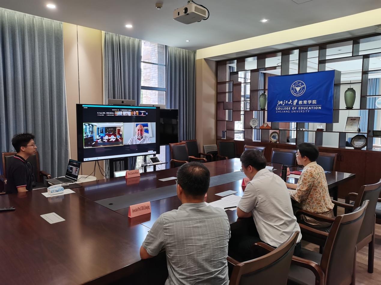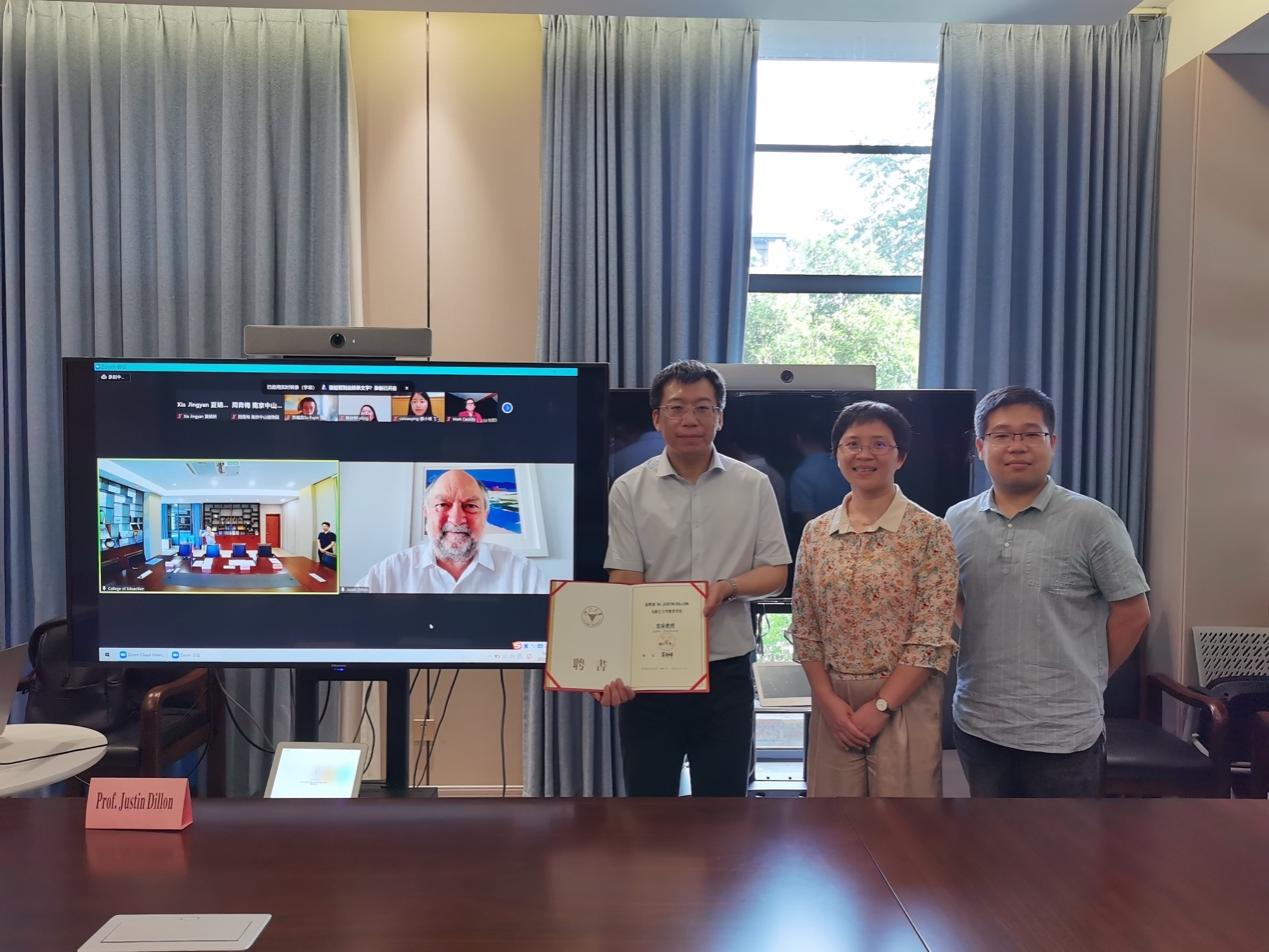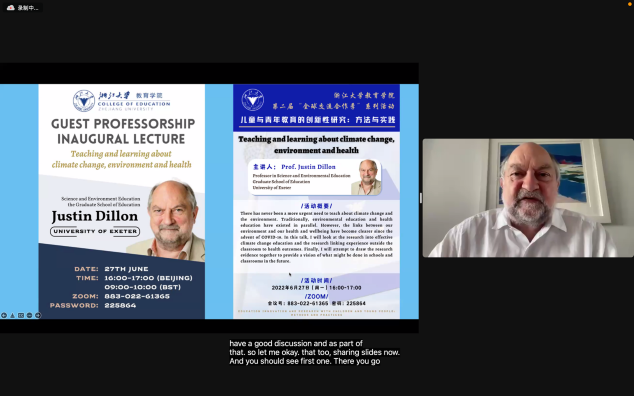 6月27日下午, Justin Dillon博士浙江大学客座教授聘任仪式暨“儿童与青年教育的创新性研究:方法与实践”国际暑期学校专题讲座在教育学院107室线下会场和Zoom线上平台同步举行。浙江大学教育学院常务副院长阚阅教授、副院长李艳教授、翟俊卿副教授、国际化岗位张潇方老师等90余名师生参加仪式。聘任仪式由副院长李艳教授主持。
