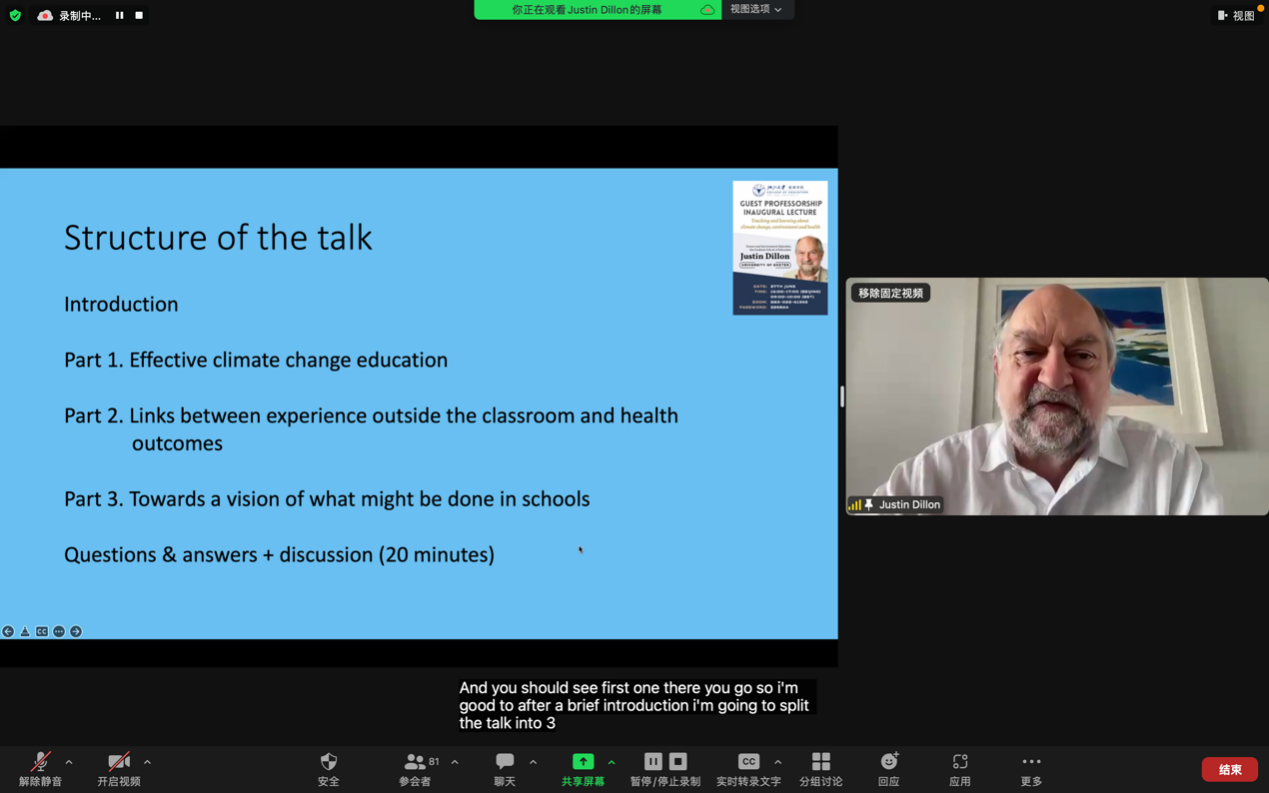 聘任仪式结束后,Justin Dillon博士以“气候变化、环境与健康的教与学”(Teaching and learning about climate change, environment and health)为题作学术讲座。Justin博士分三大板块概述科学与环境教育中的重要命题,详细介绍了气候变化教育的特点以及其教育开展的四个优先事项,阐述了校外场所的科学教育对学生身心健康发展的正面影响,并在讲座的最后以中国北京的一所小学为例展望学校在科学和环境教育方面的可为举措。