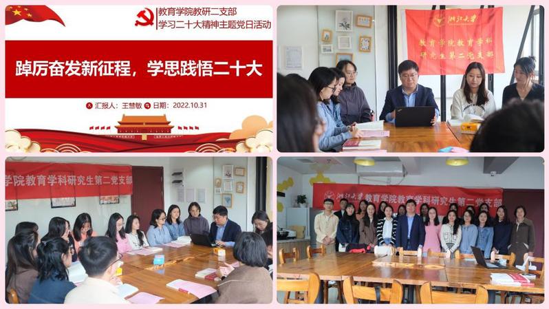 2022年10月31日中午,教育学科研究生第二党支部组织开展“踔厉奋发新征程,学思践悟二十大”主题党日活动,会议由支部书记王慧敏老师主持。