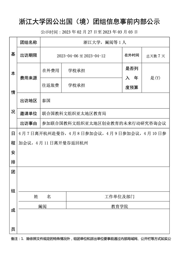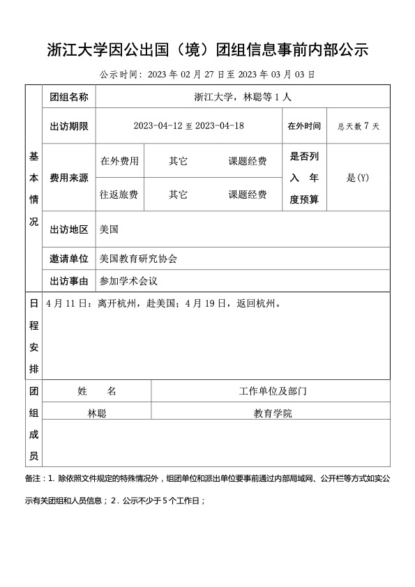 浙江大学因公出国(境)团组信息事前内部公示 (2月)
