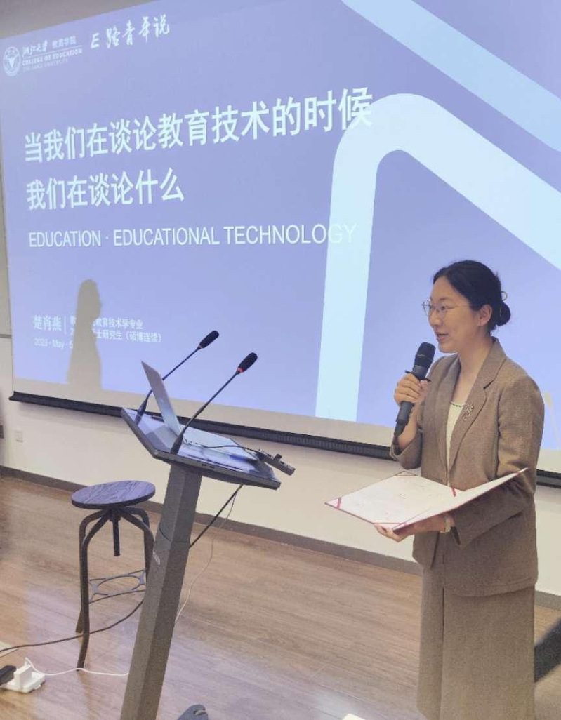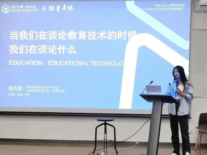 楚肖燕学姐则坦言她是天生的“教技人“。她出于正义,出于理想选择了教育学,对教育充满赤诚。学姐从自己网络学习的经历到”教育的水平线“向我们分享了她心中的教育技术的光辉使命,用教育给技术以温度,用技术给教育以未来,并告诫同学们,在这个技术不断迭代的时代,我们未来教育做好准备,不仅仅依赖昨天的环境与知识,更要教授今天的学生面向未来的世界。