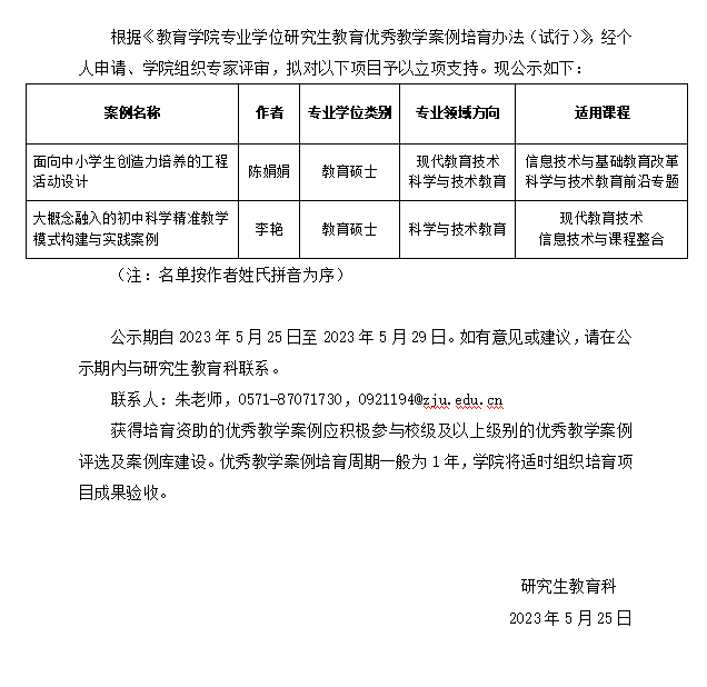 关于公示教育学院2023年专业学位研究生教育优秀教学案例培育项目的通知