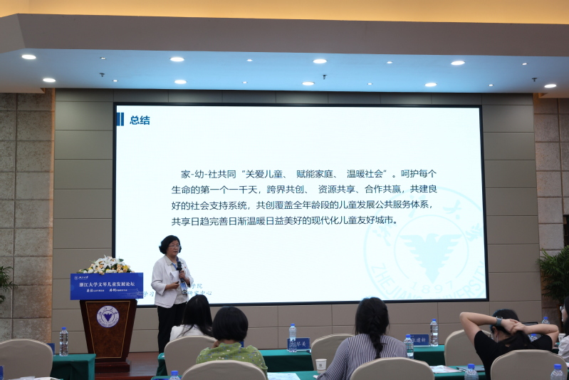 最后,浙江大学教育学院徐琴美教授带来了题为《0-3岁儿童早期发展的公共服务体系》的报告并对此次论坛作了总结。她强调,养育孩子不只是家庭的责任,而是整个社会的事务;从教育的角度思考问题时,必须考虑公平和效率。如何让所有孩子受益,尽早受益?如何花最小的努力,产生最大的效益?这是建设儿童早期发展公共服务体系亟需探索的问题。她还强调,大量儿童早期发展研究表明,儿童早期发展工作不需要很用力、很重视、投入很多的钱,如能够提供场所照看孩子几个小时,让家长可以稍微离开一下,就是一种对家庭的支持;如给予带孩子的老人一些指导,就可能大大改善老人和孩子的生活质量。徐教授最后以在嘉兴建设儿童早期发展服务体系建设的经验为例,介绍了儿童早期公共服务体系建设的“人员、平台、机制”三要素。