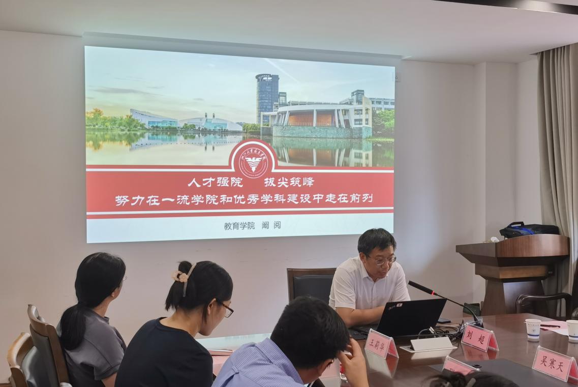 院长阚阅传达了学校暑期工作会议精神,以《人才强院 拔尖筑峰 努力在一流学院和优秀学科建设中走在前列》为题,围绕背景与形势、现状与挑战、行动与举措等方面带领与会人员重点学习了暑期会议主旨报告。他指出,在全面推进教育强国、高教强省的大背景下,在加快建设世界一流大学和优秀学科的进程中,教育学院要在构筑学科尖峰、优化专业布局、强化育人成效、注重交叉会聚、加强人才引育、推动国际合作、营造文化生态上开拓创新,勇毅前行,助推学院在高质量发展中实现战略迭代。