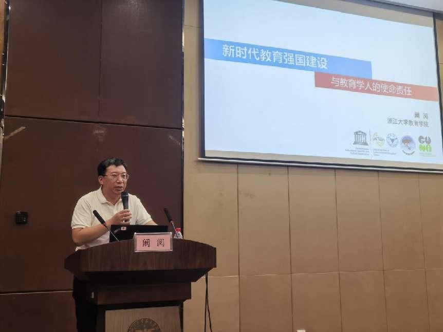 阚阅院长从教育学的前世今生切入,回顾了学院发展历程和诸多前辈先贤的事迹,围绕“一是为什么要提出教育强国建设,二是教育强国建设的目标和指向是什么, 三是如何推进和深化教育强国建设”三个方面展开。从教育救国道路上教育学人的追求与坚守到教育兴国征程上努力与突破,国际上关于教育第一的全球倡议和教育变革的全球行动这一国际共识,彰显了教育强国建设意义重大。“教育、科技、人才是全面建设社会主义现代化国家的基础性、战略性支撑。“中国教育现代化2035八大理念和基本原则,明确了2020年、2025年的发展目标。面向建设教育强国的征程中,要建立中国特色社会主义强国,以立德树人为根本任务,以服务中华民族伟大复兴为重要使命,教育理念体系制度内容方法治理现代化为基本路径,不断完善各种学制考察科学依据,进行研究改革创新,办好为人民服务的教育,要用好系统性思维,加强顶层设计和整体谋划,必须跳出教育看教育、立足全局看教育,放眼长远看教育,教育只是社会的一部分,需要根据国家与社会发展的需要去定位教育的发展。在推动基本公共服务均等化的过程中,实现优质教育资源供给。推动“人的全面发展”与“全体人民共同富裕取得更为明显的实质性进展”紧密联系在一起,发挥教育的作用。完善教育评价这一事关教育发展方向,是教育改革的关键环节等内容,逐步有效实现教育强国建设。