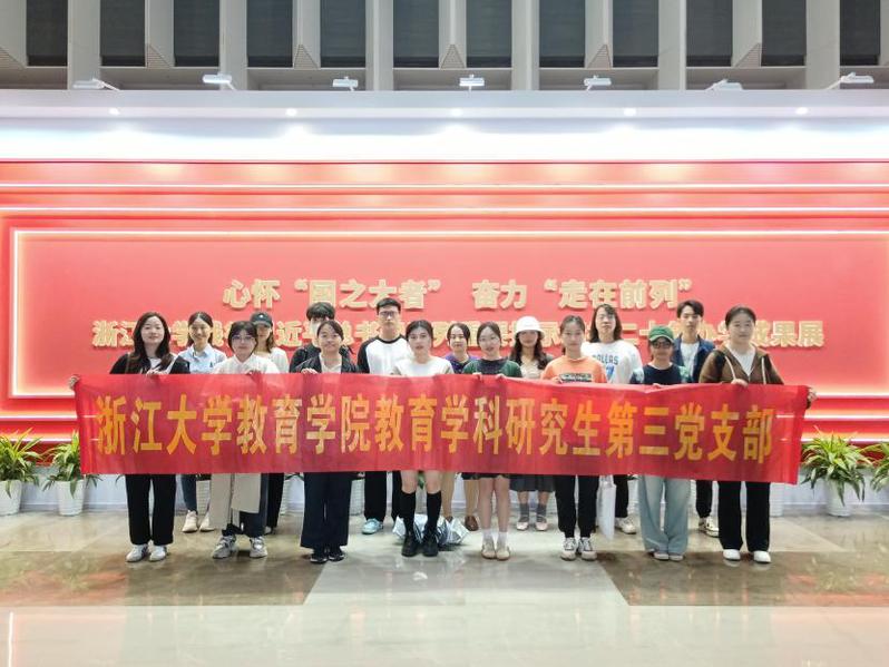 当天上午,支部党员赴管理学院A座一楼大厅参观了“心怀‘国之大者’奋力‘走在前列’——浙江大学践行习近平总书记系列重要指示精神二十年办学成果展”。本次展览全面重温了习近平总书记对浙江大学的关心指导,深入总结了二十年来学校的办学经验和发展成就,全景呈现了浙大师生持之以恒建设中国特色世界一流大学的生动实践,既是深入开展主题教育的重要成果,也是激励全校上下进一步心怀“国之大者”、奋力“走在前列”的重要举措。该展览聚焦厚植家国情怀、善用“大思政课”、自主培养拔尖创新人才、擦亮创新创业品牌、助推学生全面发展、激励教师争当“大先生”六个板块,展现“培养什么人、怎样培养人、为谁培养人”的教育根本问题。